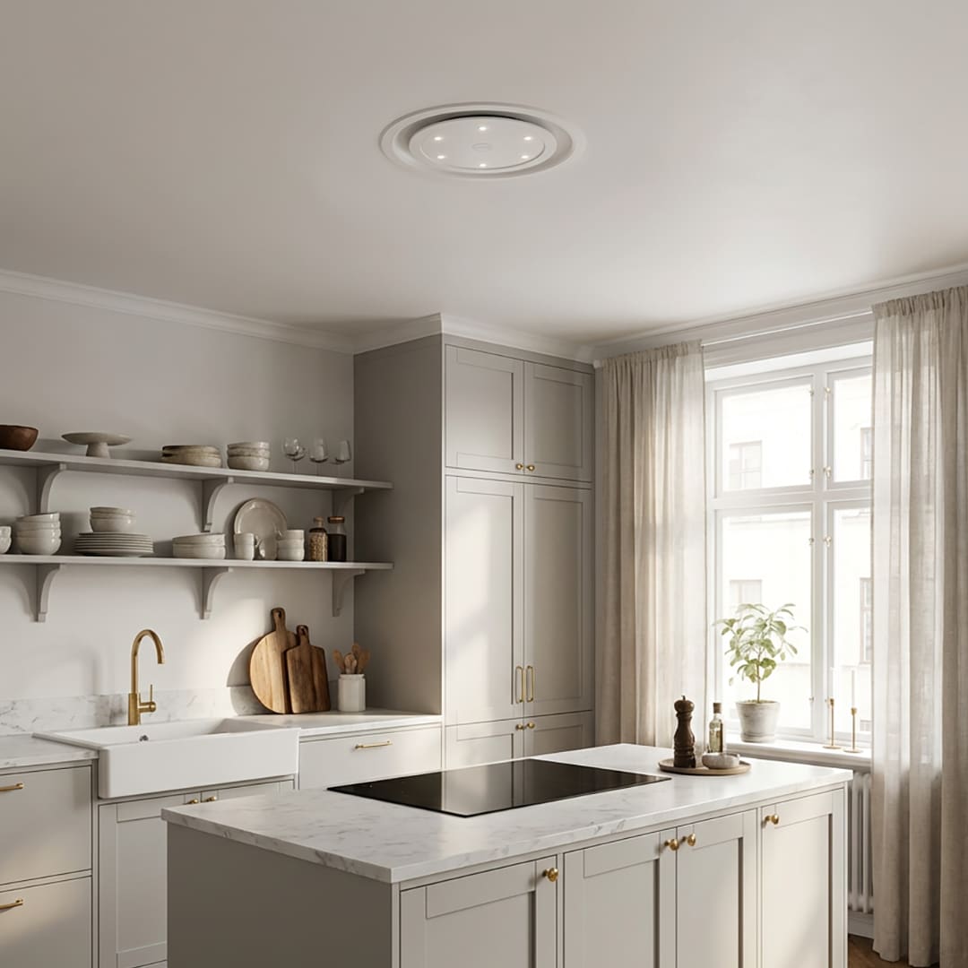 Inspirationen till den unika köksfläkten Ocean kommer ursprungligen av takrosetter men har utvecklats med en formgivningen för ett mer samtida uttryck. Ocean får sitt effektiva luftflöde genom trycksvarvade komponenter. Diametern på endast 60 cm ger ett nätt och nästintill försvinnande intryck.