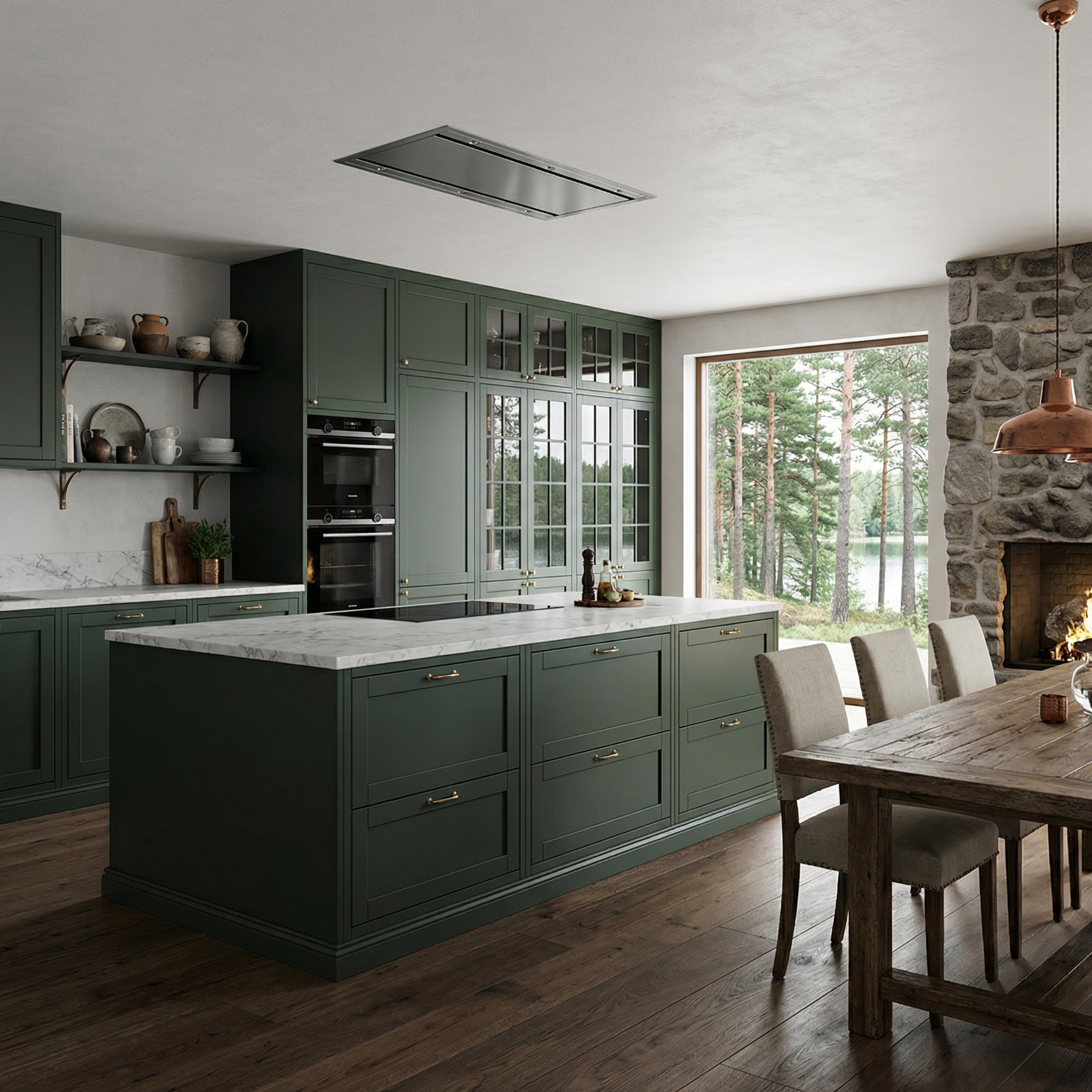 En takintegrert kjøkkenvifte er en effektiv løsning som åpner kjøkkenet. Her finner du flere forskjellige alternativ for både innfelt og utenpåliggende montering.